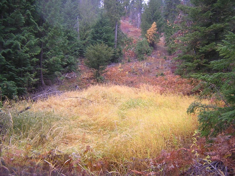 Fall -- 1 November 08 -- In these hills there are only a few weeks between the leaves turning and the first snowfall. This photo is the "parking lot" looking north. In September I chatted with my neighbor and found out that before the latest loggers used this spot as a staging area, it was dense forest. If someone else had bought the land, they'd be building a giant house here. I'd like to eventually terrace it and plant more fruit trees. Those yellow trees you see are larches, conifers that shed their needles every year.