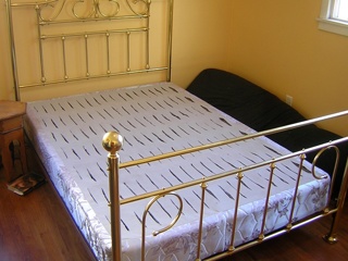 For the last two weeks I've been trying to put a bed together. Beds are challenging! If they were easy, nobody would spend a thousand dollars on a mattress. Personally I sleep fine on a futon on the floor, and that's what I've been doing all summer, but I have to flip it over and prop it up every morning to air it out, so it doesn't get moldy like the last futon which is now composting in the future strawberry patch. Bodies put out a lot of moisture in the night, which is why so many "futons" are modern mattresses with inner springs and layers of foam. But it's hard to make a spring mattress that's not too soft, and some foam is toxic, probably not in mattresses but I still don't trust it. I wanted an all-cotton futon, on a regular bed frame, with some way to let it breathe.
