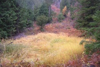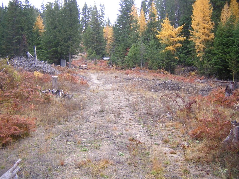 Fall -- 1 November 08 -- In these hills there are only a few weeks between the leaves turning and the first snowfall. This photo is the "parking lot" looking north. In September I chatted with my neighbor and found out that before the latest loggers used this spot as a staging area, it was dense forest. If someone else had bought the land, they'd be building a giant house here. I'd like to eventually terrace it and plant more fruit trees. Those yellow trees you see are larches, conifers that shed their needles every year.