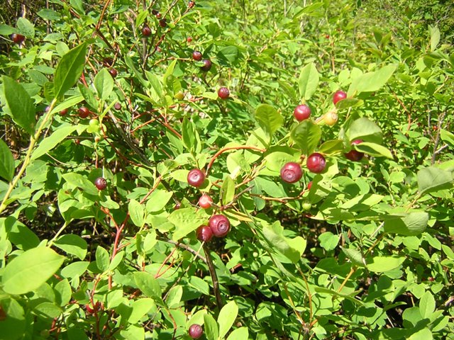 Huckleberries -- 14 July 08 -- I have a lot of wood to saw, but I really couldn't get into it on this trip, especially in the heat. I'm hoping in a year or two I'll be able to get some clean synthetic fuel or biofuel that will make it tolerable for me to bring out the chainsaw. I enjoy hand sawing much more than chainsawing, but thirty minutes of chainsawing would be better than thirty hours of hand sawing.