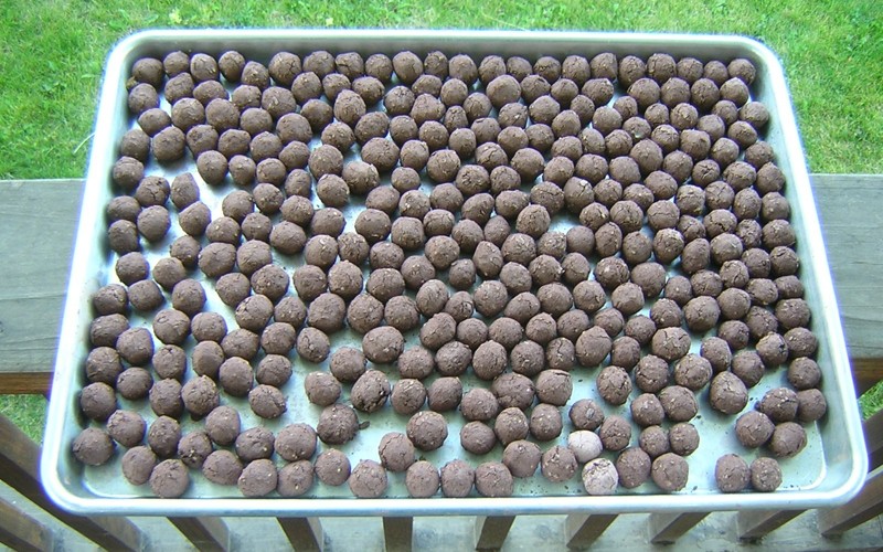 There was a big problem that was not mentioned in any of the how-to pages I looked at. One tray of seedballs totally cracked, and after drying they crumbled to dust under almost no pressure. And it was the first tray, which I was the most careful with. Here's my theory: the seeds expand when they get wet, and in the first tray, I made the balls before the seeds expanded, so when they did, they cracked the balls. The later trays were made with seeds that had been wet for a while and already expanded. So my advice for seedball makers is to mix in the water and then wait an hour before you start rolling.