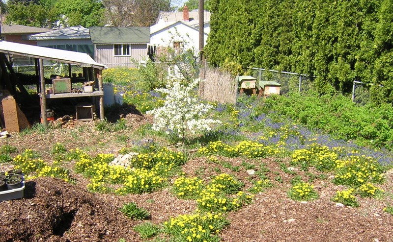 April 20. This time of year I see all the work my neighbors are putting into their lawns, while my back yard is prettier with less work and less water. That's a cherry tree in the center, a peach and apricot back behind it, a strawberry patch below it and to the right, raspberries on the right against the fence, tomato starts in the lower left, and the purple flowers are grape hyacinth that survive the dry summers and spread by themselves. Of course the yellow flowers are dandelions, which are completely edible, attract pollinators, and improve the soil. They're one of the most helpful and beautiful plants in the world, and yet people see them as a pest and try to eradicate them (and fail).