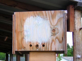 A day or two later, the #1 hive swarmed again! They settled on a low branch, and I made a post on the local permaculture group to see if anyone wanted them. (I've decided to stay below the radar of the local beekeeping groups in case some of them are militantly in favor of treatments.) Nobody bit, again they stayed the night outside, and late the next morning they were gone. Did they go back to the original hive? Now my memory is vague, because there was a fourth swarm, up high in the spruce tree again, and there was another day when we were gone and might have missed seeing a fifth swarm, and somewhere in there, a swarm occupied one of my bait hives, not the one in the tree in the front yard but the one under the garage awning, which you can see in the photo above.