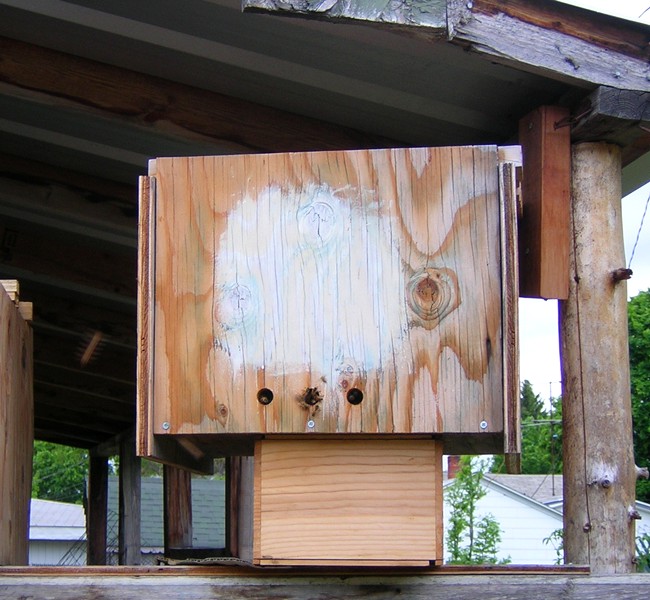 A day or two later, the #1 hive swarmed again! They settled on a low branch, and I made a post on the local permaculture group to see if anyone wanted them. (I've decided to stay below the radar of the local beekeeping groups in case some of them are militantly in favor of treatments.) Nobody bit, again they stayed the night outside, and late the next morning they were gone. Did they go back to the original hive? Now my memory is vague, because there was a fourth swarm, up high in the spruce tree again, and there was another day when we were gone and might have missed seeing a fifth swarm, and somewhere in there, a swarm occupied one of my bait hives, not the one in the tree in the front yard but the one under the garage awning, which you can see in the photo above.