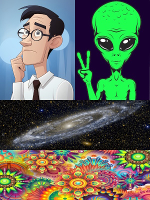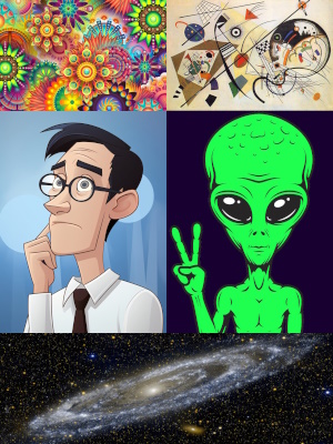 To pad my desktop view, I'm putting image credits here. The humans and green alien are from freepik.com; I can't find the original source for consciousness; the galaxy is M31 in Andromeda from Wikimedia commons; alien consciousness is the painting Transverse Line by Kandinsky; and the alien below is from Ophanim by Danilo Wolf.