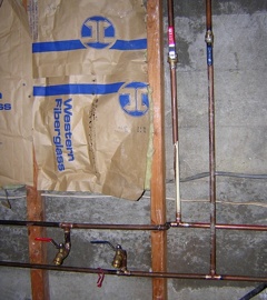 Epic Plumbing -- 7 June 2012 -- This house has been a plumbing challenge from the beginning. Even before I bought it, I knew from the HUD inspection that the lines didn't hold water. There turned out to be a big leak from the front outside hose faucet, a moderate leak from the dishwasher connection under the kitchen sink, and several minor leaks. When I got back from my winter tour, I noticed a leak in the basement where a PVC pipe connected to a brass shutoff valve. Rather than fix it, I decided to tear out all the PVC supply pipes in the basement and replace them with soldered half inch copper.