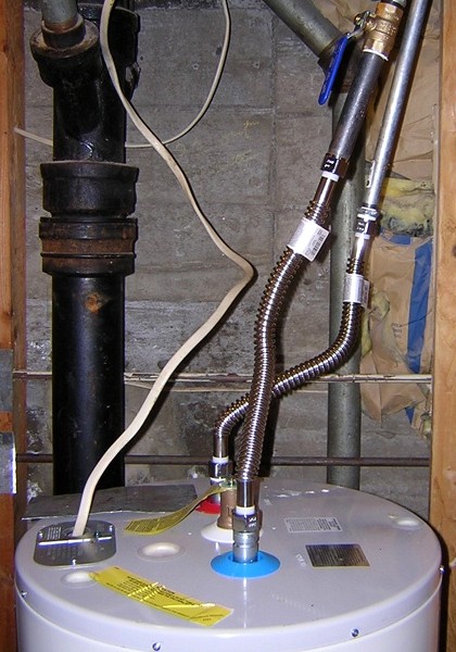 Anyway, installing the new heater was easy, because the pipes were already set up for where I was going to put it. The only tricky thing was how to connect it. I looked on some forums, and most people say the braided steel connectors are crap and the hot water will ruin the tubes inside. There was a regional faction that said you should not use flexible connectors at all but hard pipes the whole way. I decided to go with flexible corrugated stainless steel connectors, which were less than $10 each at Lowes. Here's a photo.